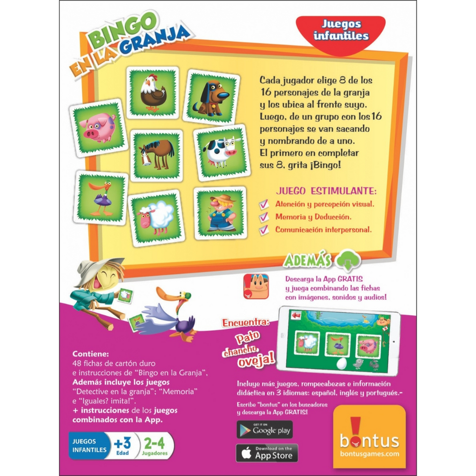 Contenido: 48 fichas de cartón duro e instrucciones de "Bingo en la granja". Además incluye los juegos "detective en la granja"; "Memoria" e "Iguales? Imita!"