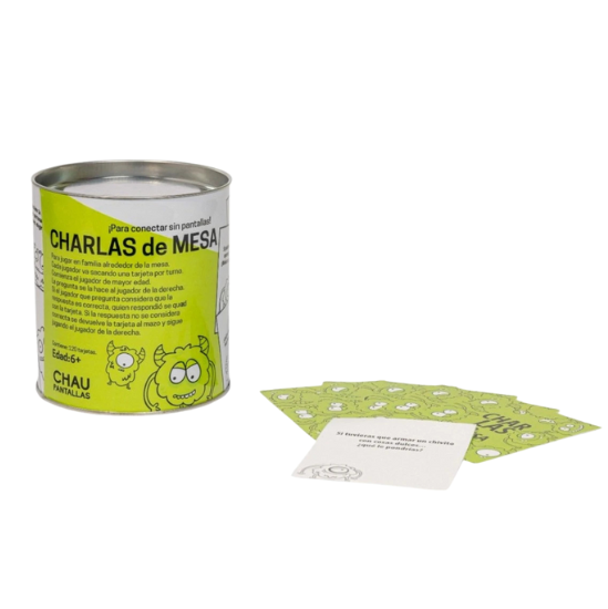 Charlas de Mesa es el primer juego de chaupantallas que incentiva la conversación, las risas, la confianza y la creación de recuerdos entre padres e hijos. Para conectarse sin pantallas. Con este juego ayudan a sus hijos a descubrir sus ambiciones, miedos, preferencias y pasiones. Aprender más de cada uno y reforzar el vinculo.