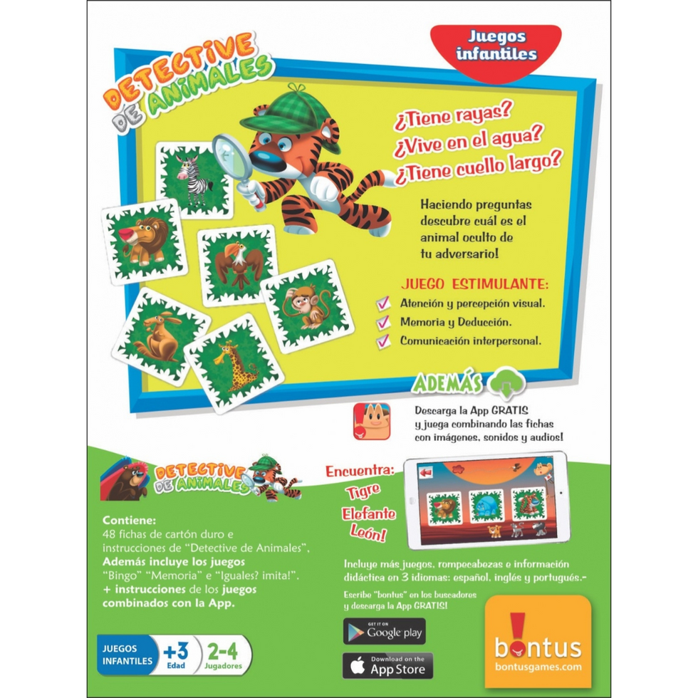 Contenido: 48 fichas de cartón duro e instrucciones Además incluye los juegos "Bingo"; "Memoria" e "Iguales? Imita!"