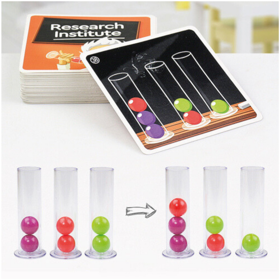 El brillante Dr. ¡Eureka tiene experimentos importantes para que complete! Elige una tarjeta de desafío, 3 tubos de prueba y 6 bolas de colores para resolver su fórmula científica.