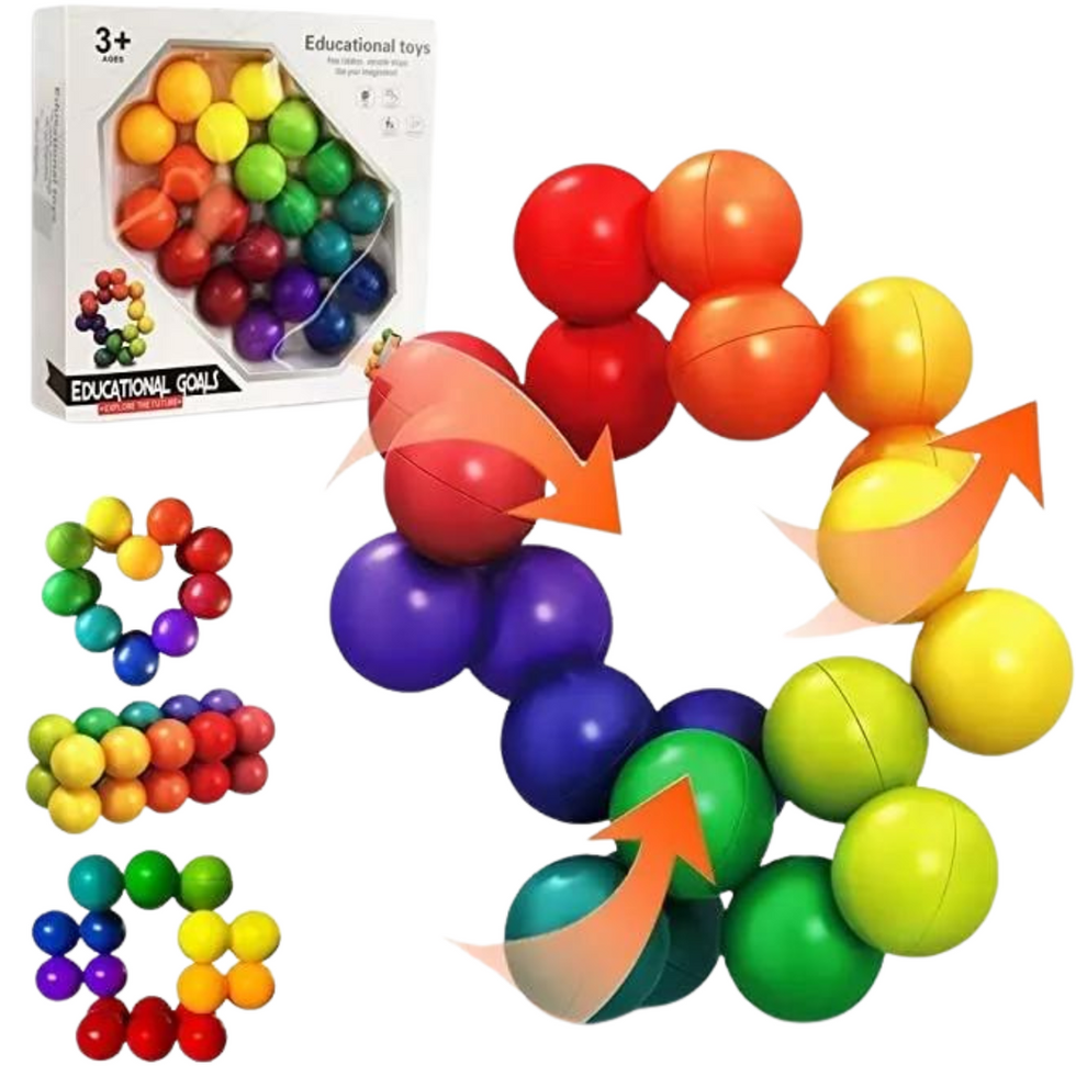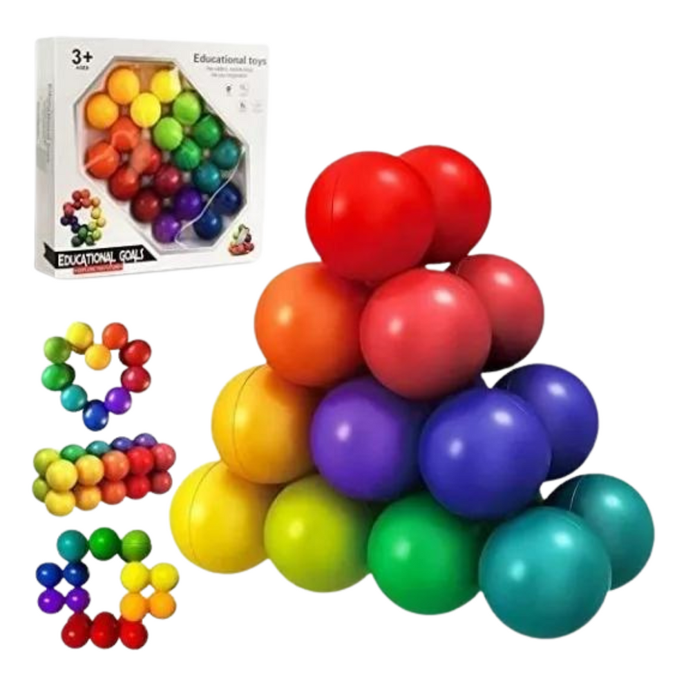 La bola educativa se compone de 20 bolas de color arcoíris, y cada bola está conectada con dos bolas respectivamente. Esta estructura especial permite que la bola educativa obtenga diferentes estructuras morfológicas girando la bola.