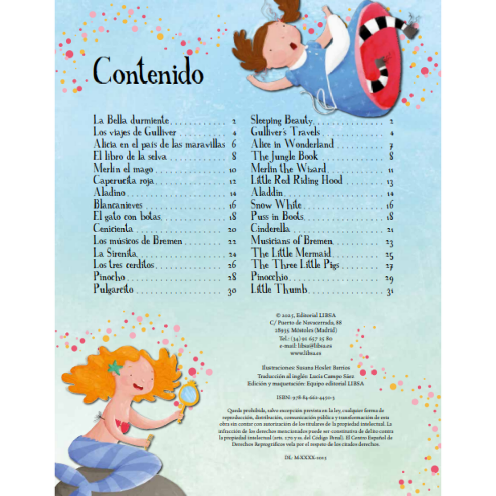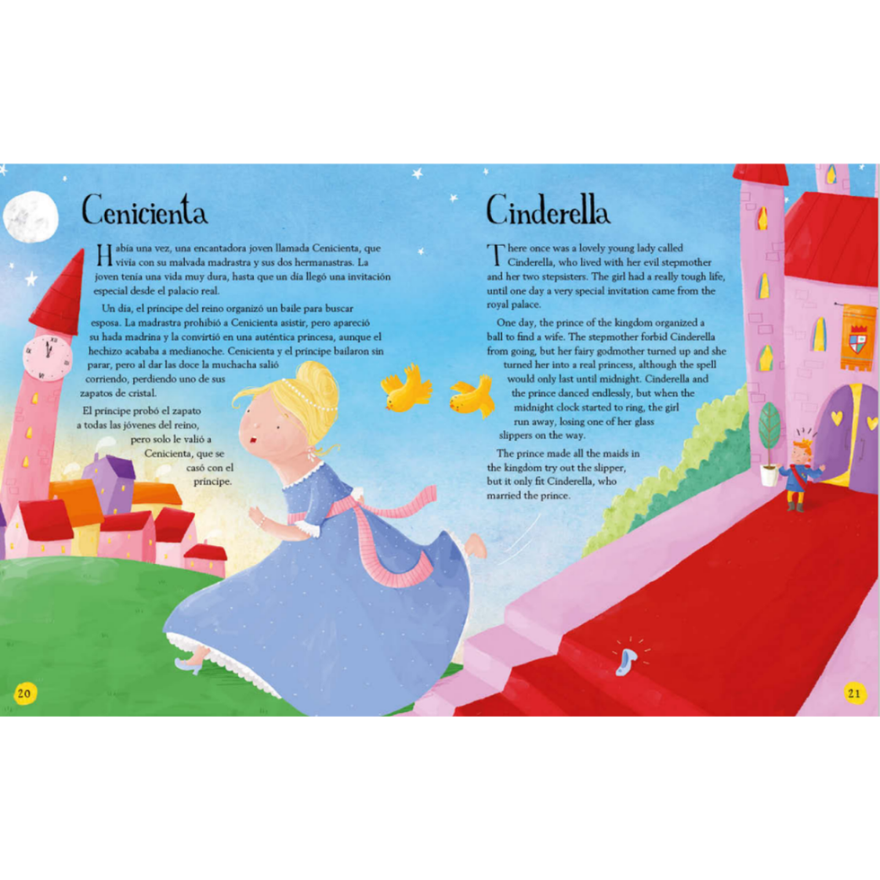 Si el primer conocimiento lingüístico se adquiere a través de los cuentos clásicos, para practicar con una lengua extranjera no debería ser diferente. Por eso, presentamos este volumen con una selección de los cuentos clásicos más conocidos y entrañables en versión bilingüe español-inglés. El libro desarrolla 15 cuentos en una estructura comparada de doble página con el texto en español y su equivalente en inglés ilustrados a todo color. La versión presta atención a la edad de los pequeños lectores, ofreciendo frases cortas y sencillas y un vocabulario básico con el que comenzar a aprender un idioma de la manera más agradable: a través de sus personajes favoritos.
