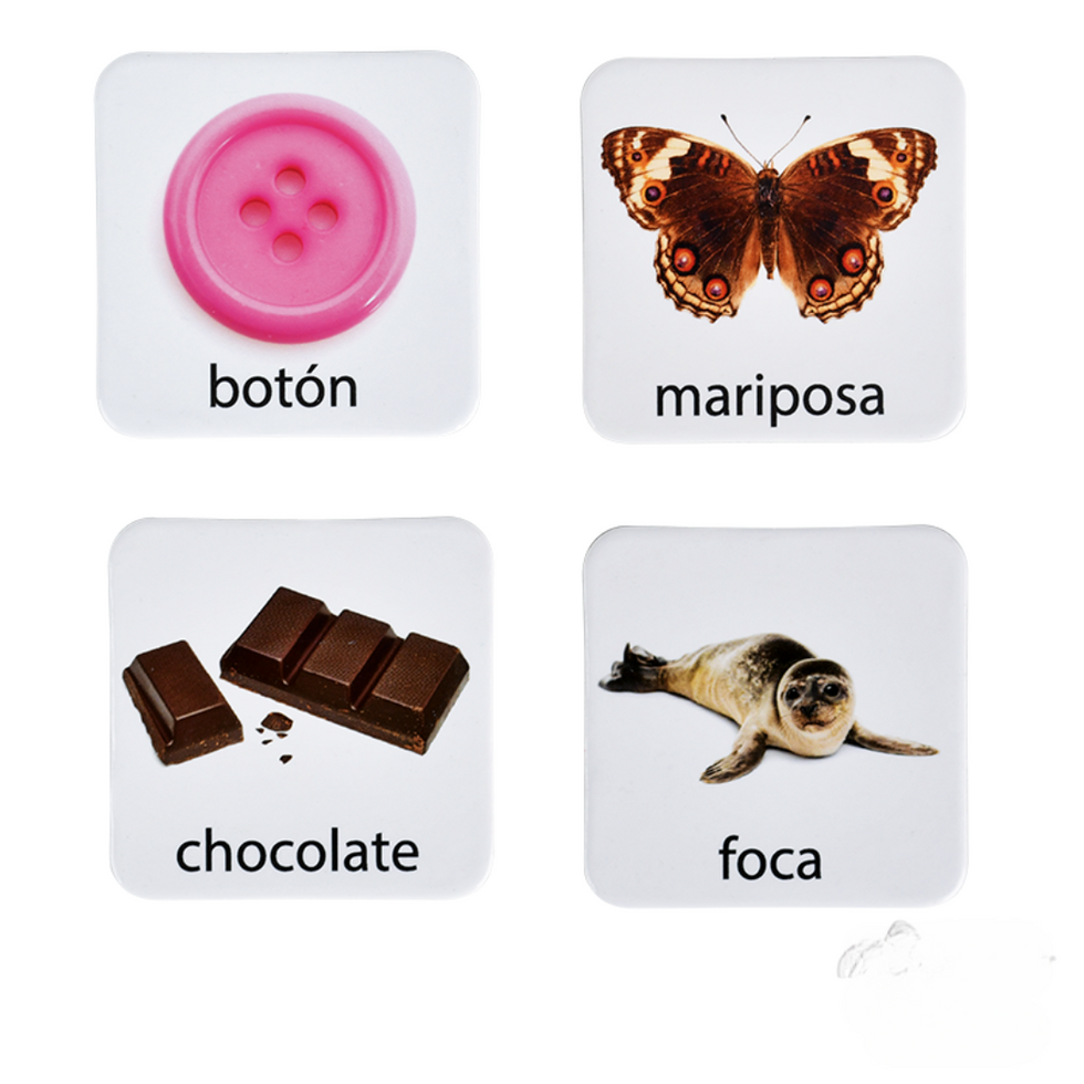 Contiene 4 tableros de 16,5 x 17,5 cm y 36 fichas con imágenes de 4,5 x 4,5 cm. Incluye código QR con enlace a canciones en YouTube para practicar.