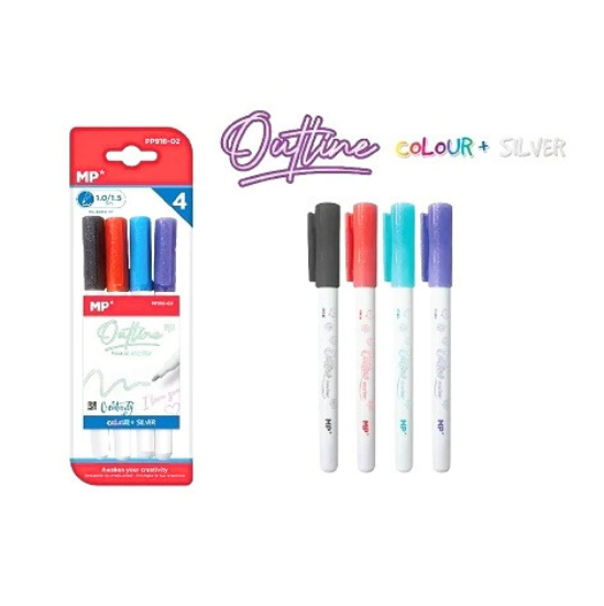 Con un trazo metalizado plata y un contorno de color generado por la separación de tintas, son ideales para tarjetería, manualidades y journaling.