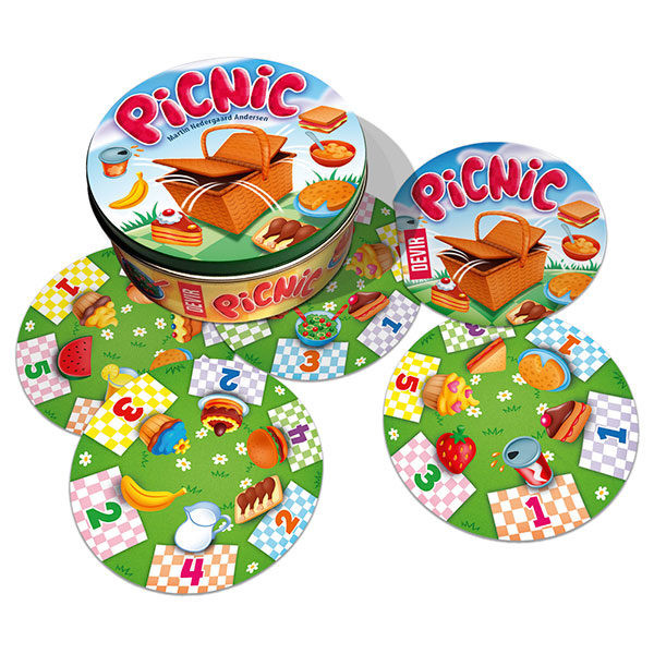 En Picnic cada jugador elige cual va a ser su comida favorita durante la partida. ¿Deliciosos sandwiches? ¿Sabrosos pasteles? ¿Refrescantes piezas de fruta? Se reparten todas las cartas y cada jugador deberá ser el primero en deshacerse de todas ellas, de una en una, siguiendo el orden numérico de la última carta jugada. Un juego adictivo para toda la familia ideal para llevárselo de Picnic.