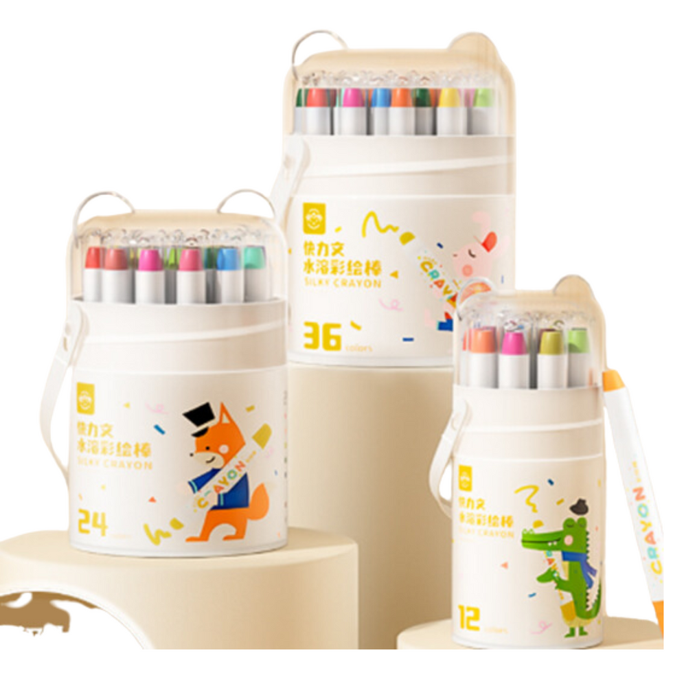 Son crayolas, pasteles y acuarelas. Estos últimos se logra mojando la punta de la crayola en un recipiente de agua o pintando con un pincel.